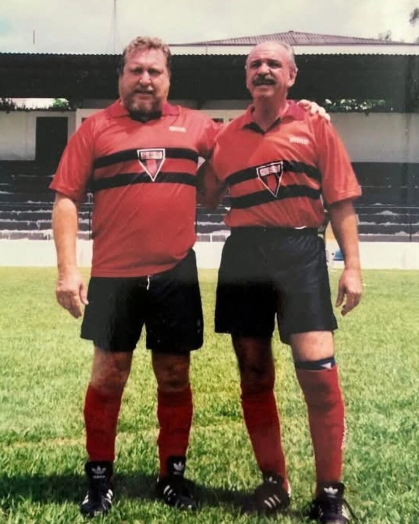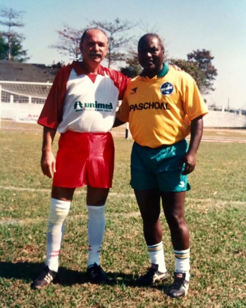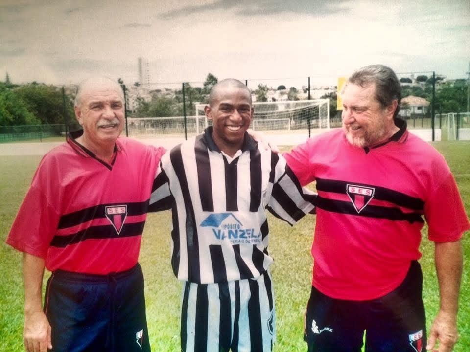 FOTOS DOS MEMORIAL RUBRO-NEGRO: Neno ao lado de Bellini (campeão mundial pelo Brasil em 58 e 62), Mineiro (campeão do mundo pelo São Paulo), Edu (craque do Santos e da Seleção), Pintado (que jogou e coordenou o time de veteranos da SES) e Lúcio Doval (presidente que o homenageou, em 2015).